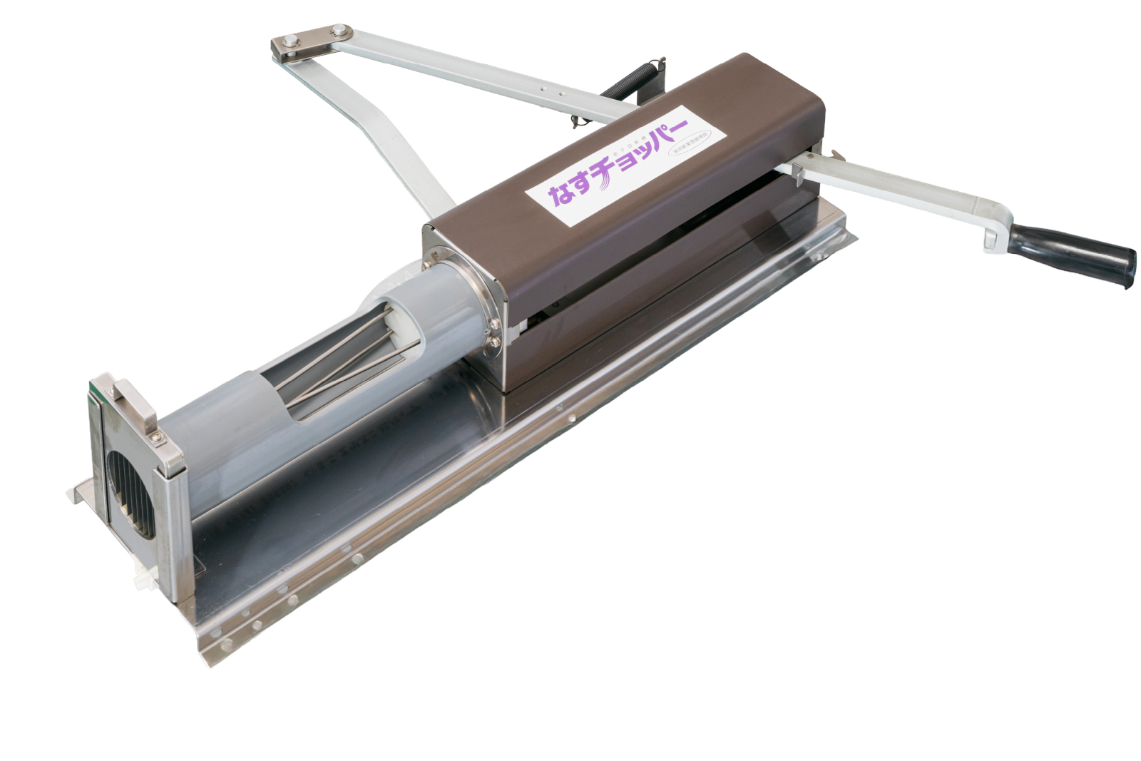 へたを取り除いたナスを入れ、ハンドルを引くだけの簡単な動作。短時間で一定の厚さにカットすることができ、しかも大量に処理できます。
